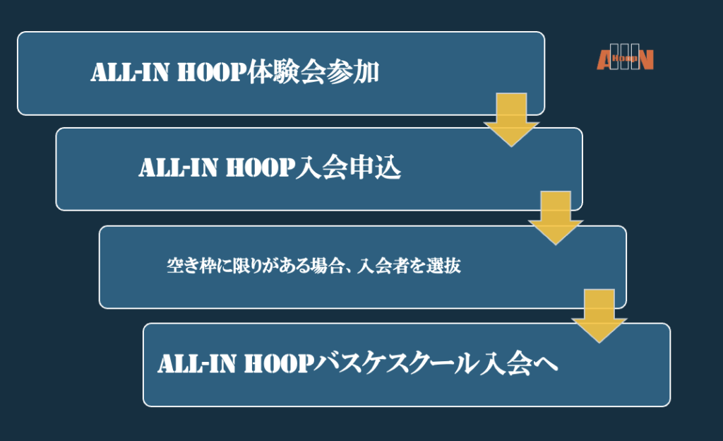 - All-IN HOOPバスケスクールは原則、体験会にご参加いただいた選手をスクールへご入会案内いたします。